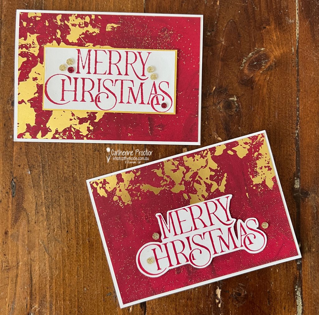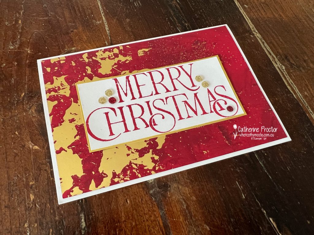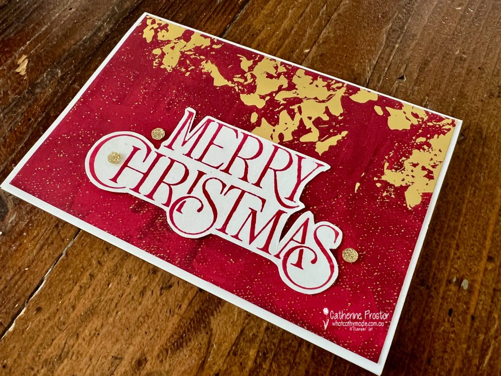 • The large Merry Christmas Stamp, inked in Real Red Classic Stampin’ Pad