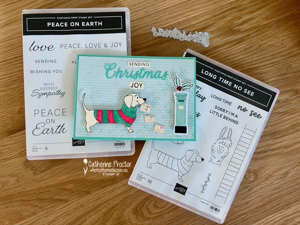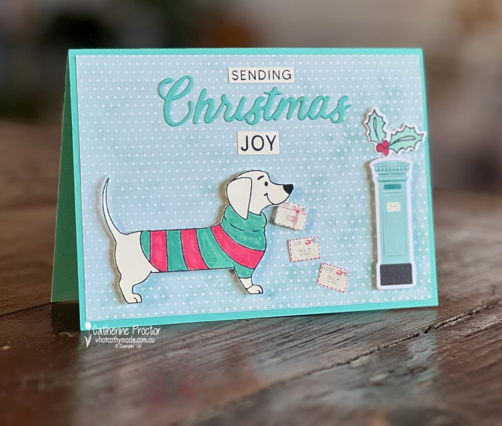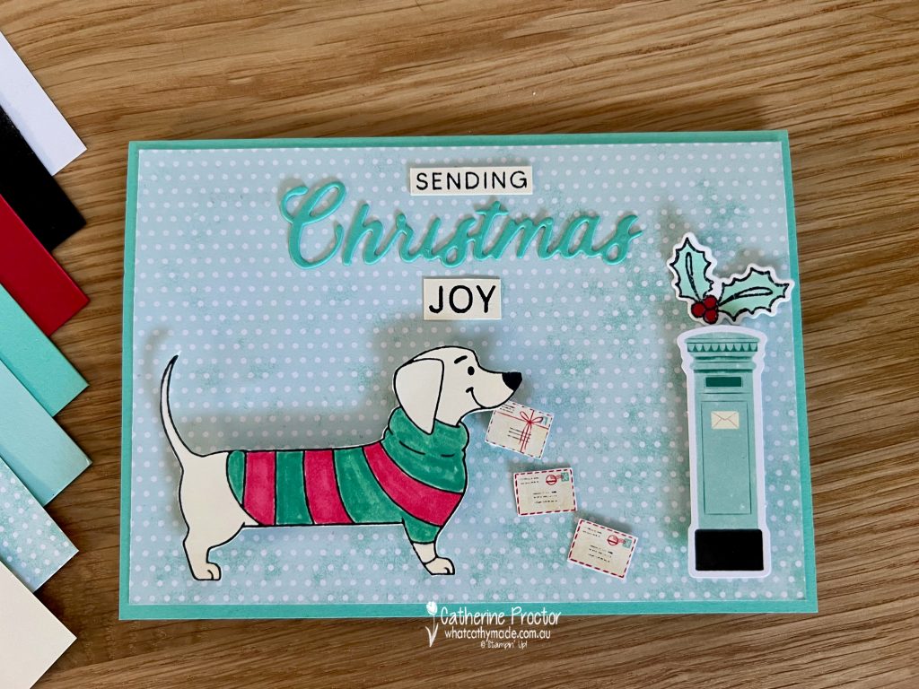 The adorable dog image comes from the Long Time No See stamp set, coloured with Stampin’ Blends to match his festive jumper.