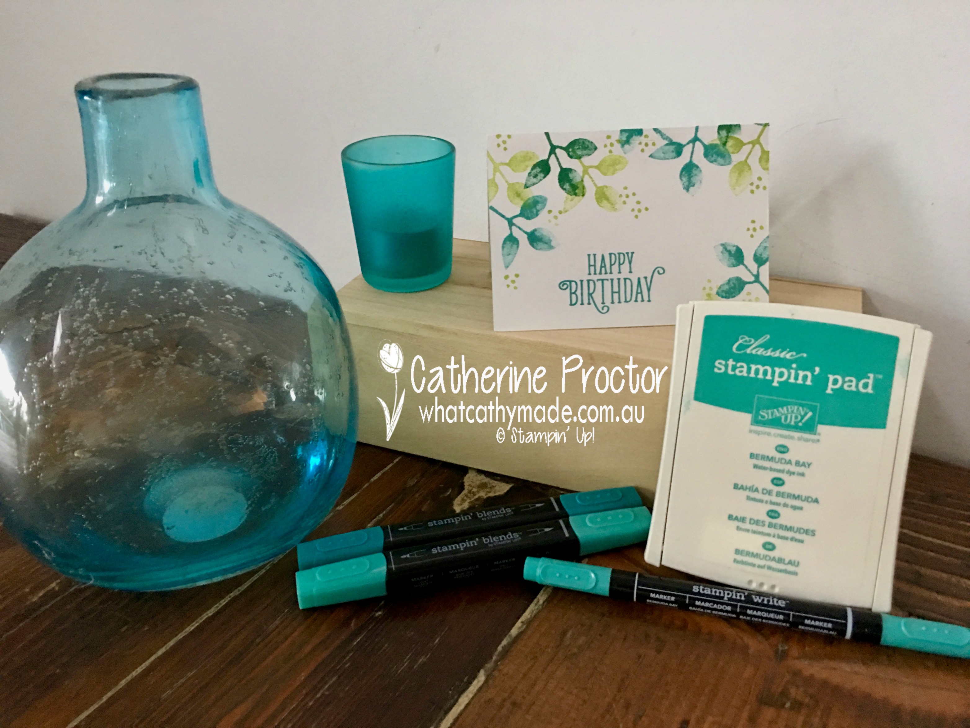 Bermuda Bay is often paired with Pool Party (and they look amazing together) but it also really looks great when used with Lemon Lime Twist. To showcase this colour combination I’ve used something old (the Painted Harvest stamp set) and something new (the Pop of Petals bundle) for my three Bermuda Bay cards.