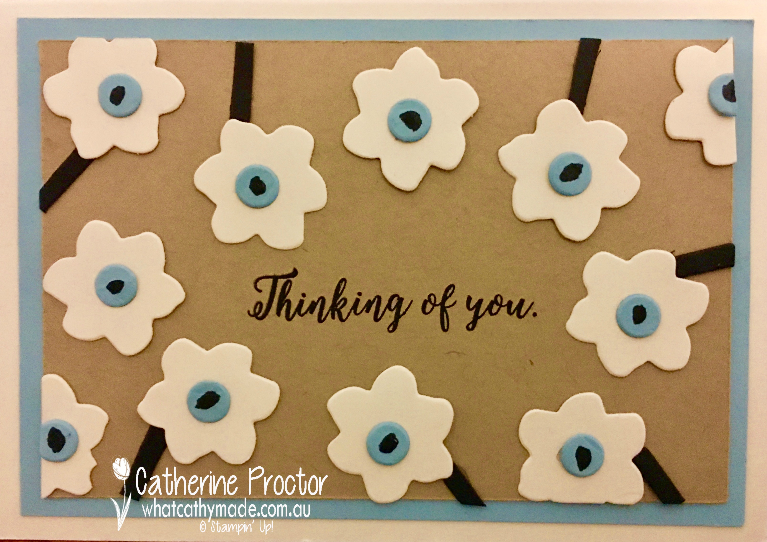 The flowers, their centres and their stems were cut from cardstock using the Seasonal Layers thinlit dies. The stems were made using the Adirondack chair die cut into smaller pieces, and the middle of the flower was coloured in with a black marker. The sentiment comes from the matching stamp set, Colorful Seasons.