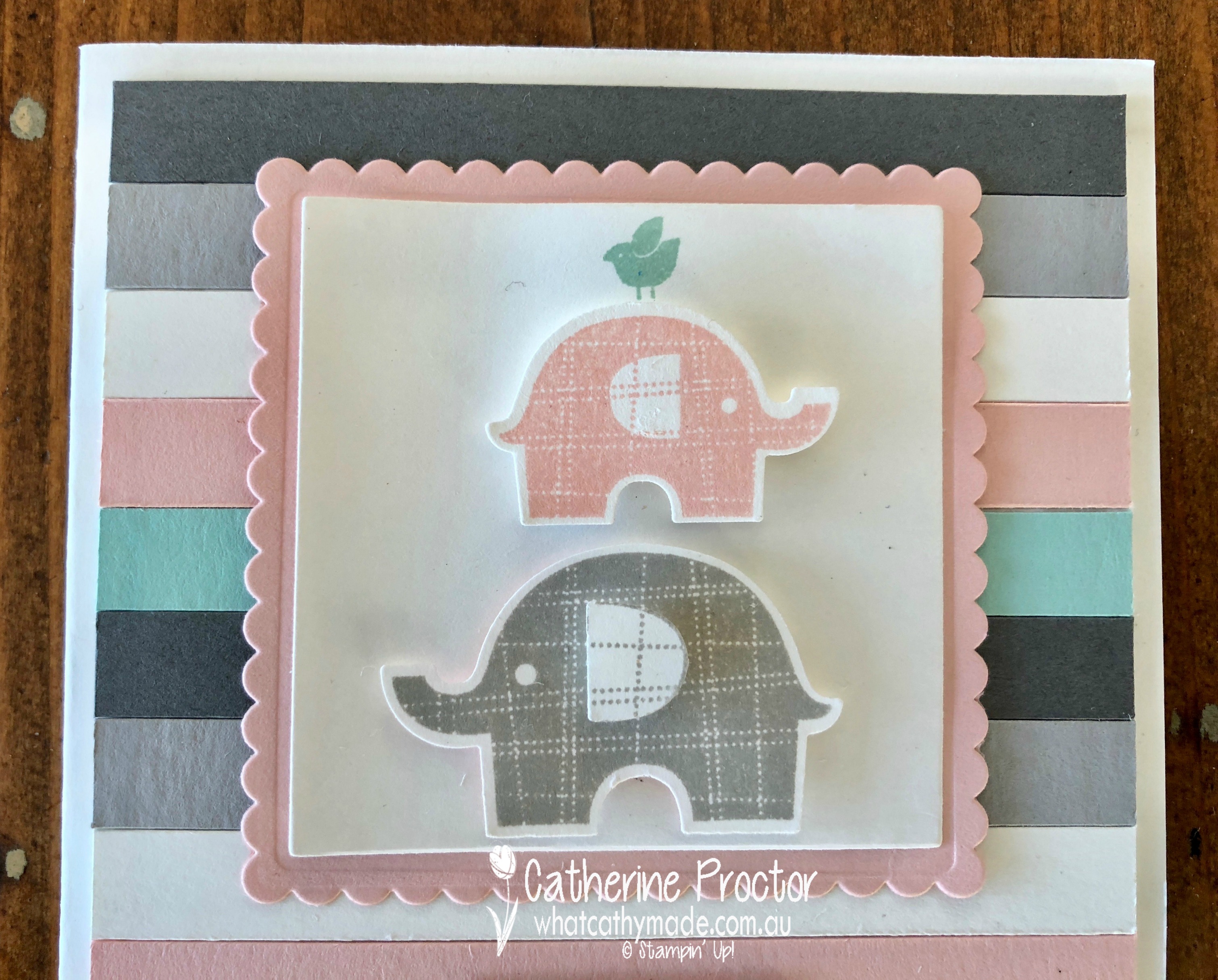 I love striped DSP but there wasn’t any in the right colours to match the baby quilt I’d made as a gift so I used my Stampin’ Up! trimmer to cut 1cm strips of Basic Gray, Smokey Slate, Whisper White, Powder Pink and Pool Party card stock and layered them horizontally over three vertical strips of tear and tape.