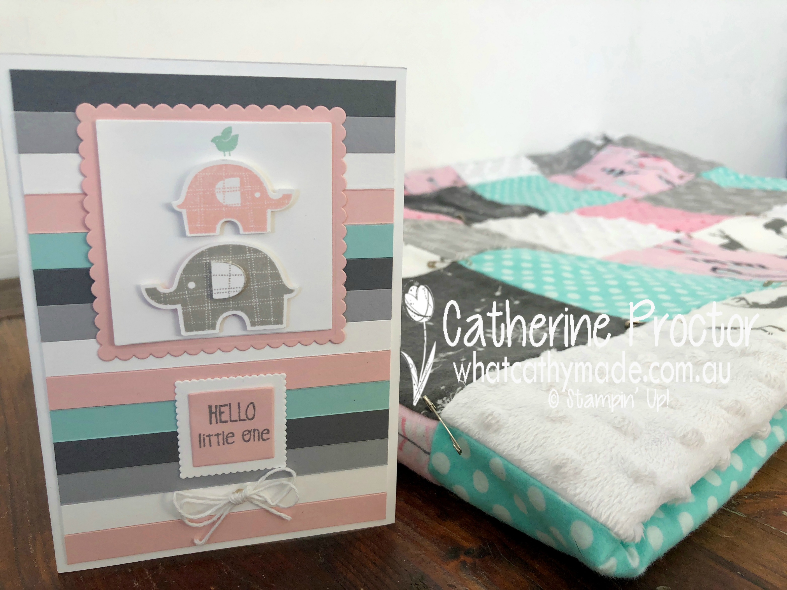 Once I finish quilting it (and I’d better get my skates on as she’s due in the next couple of weeks!) I’ll wrap it up and present it with my matching CASEd card, which I made using a fantastic new punch bundle called Little Elephant bundle.