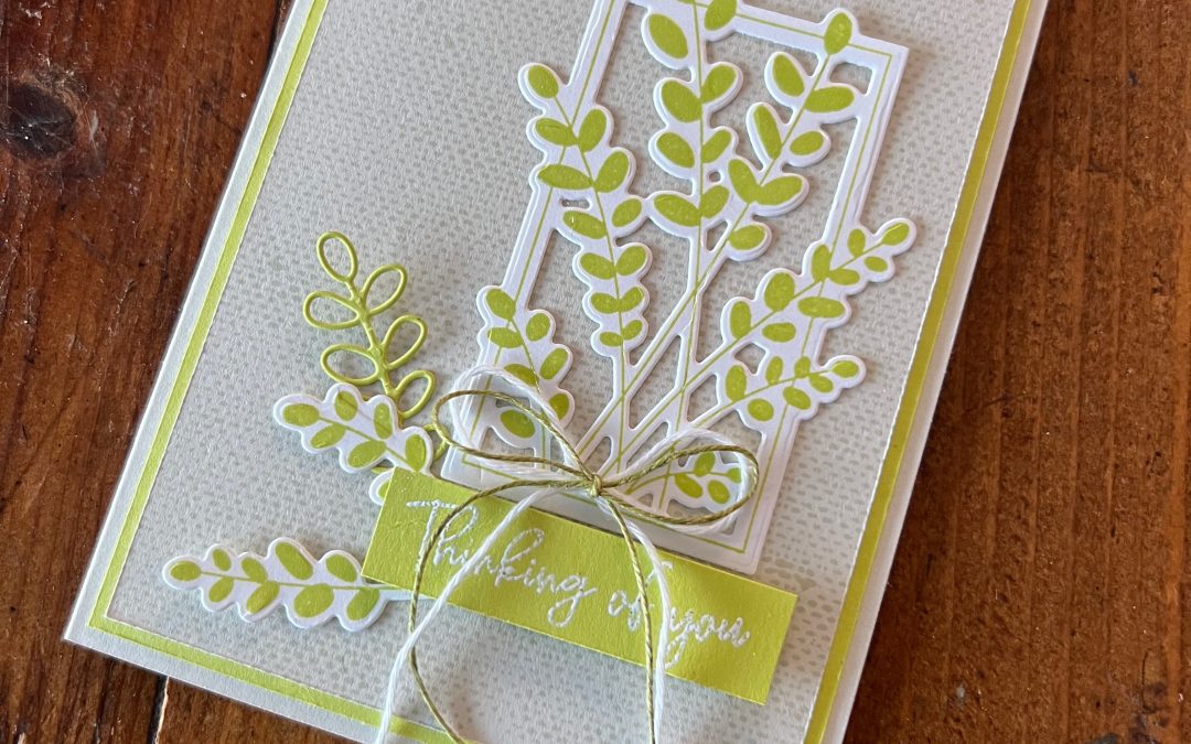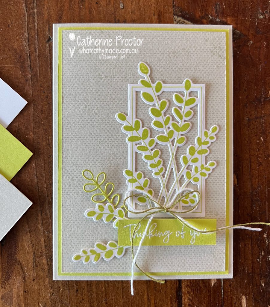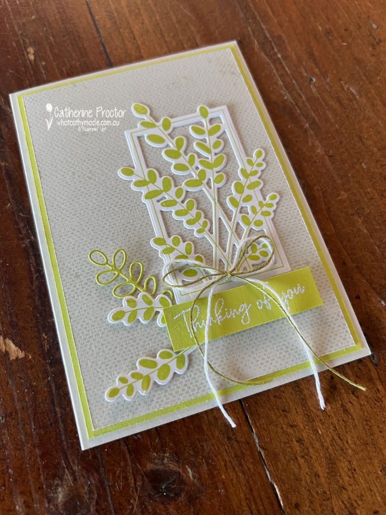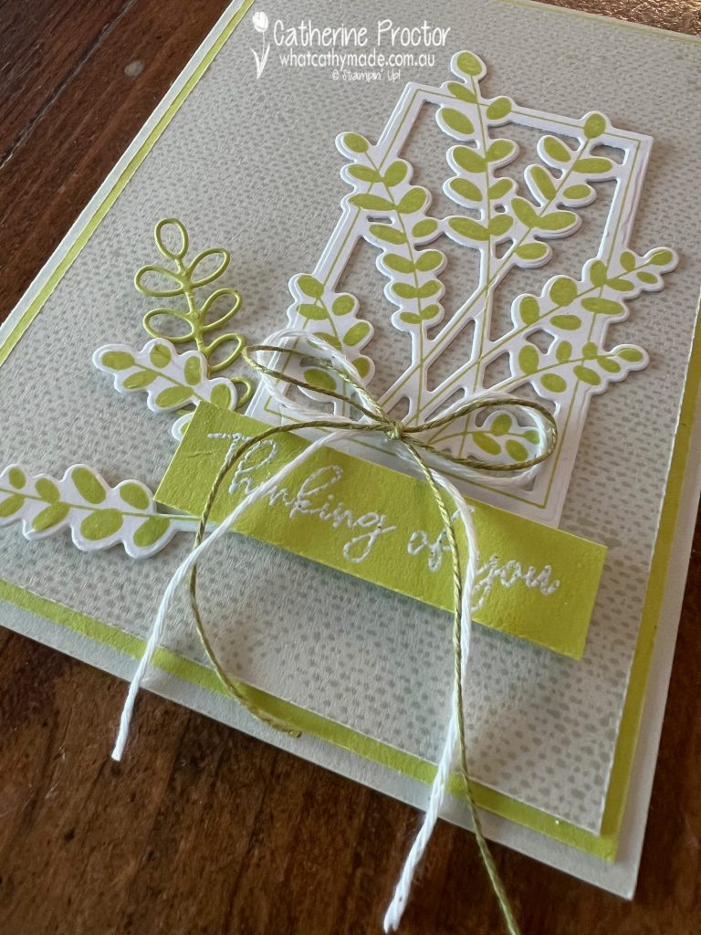 I’ve also added an extra layer of Lemon Lime Twist to the base card, some more of the pretty foliage elements and changed the length and positioning of the “Thinking of you” sentiment.