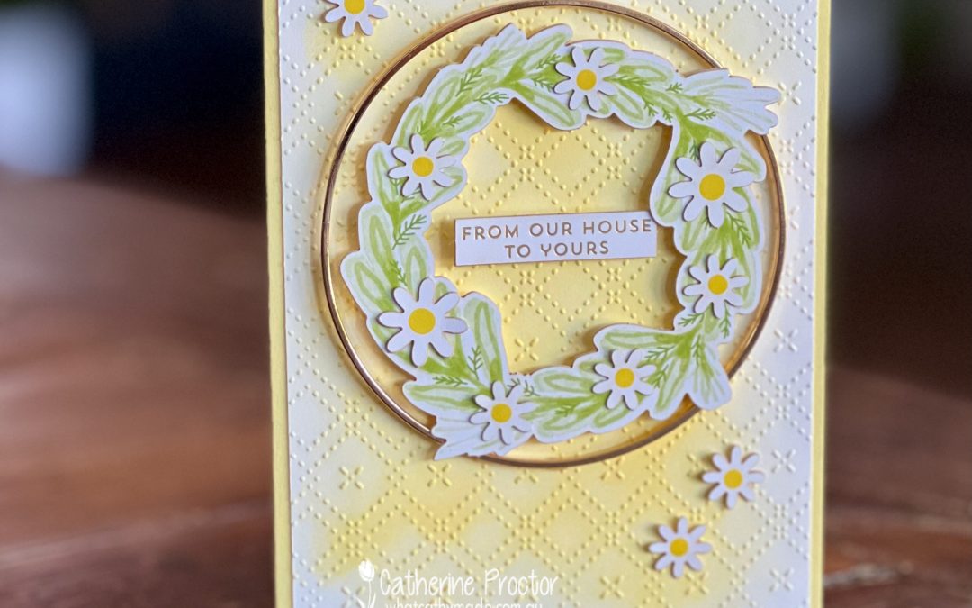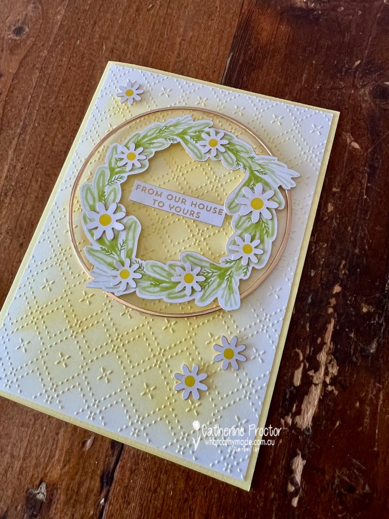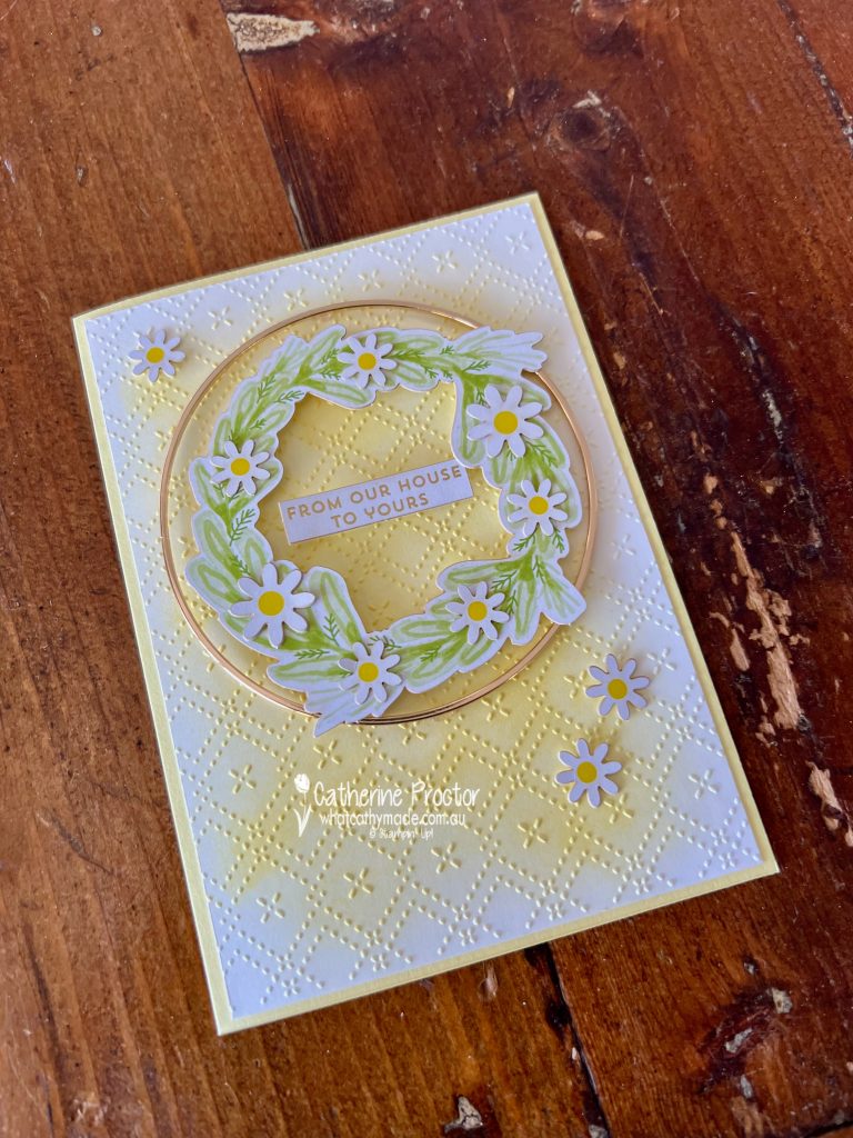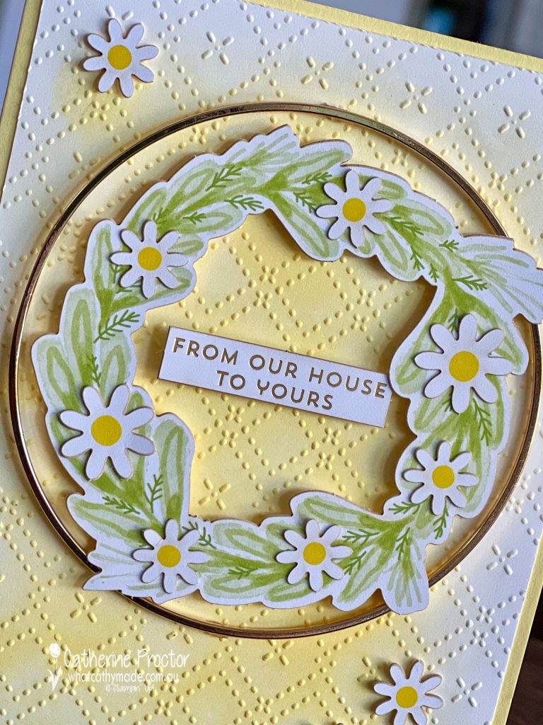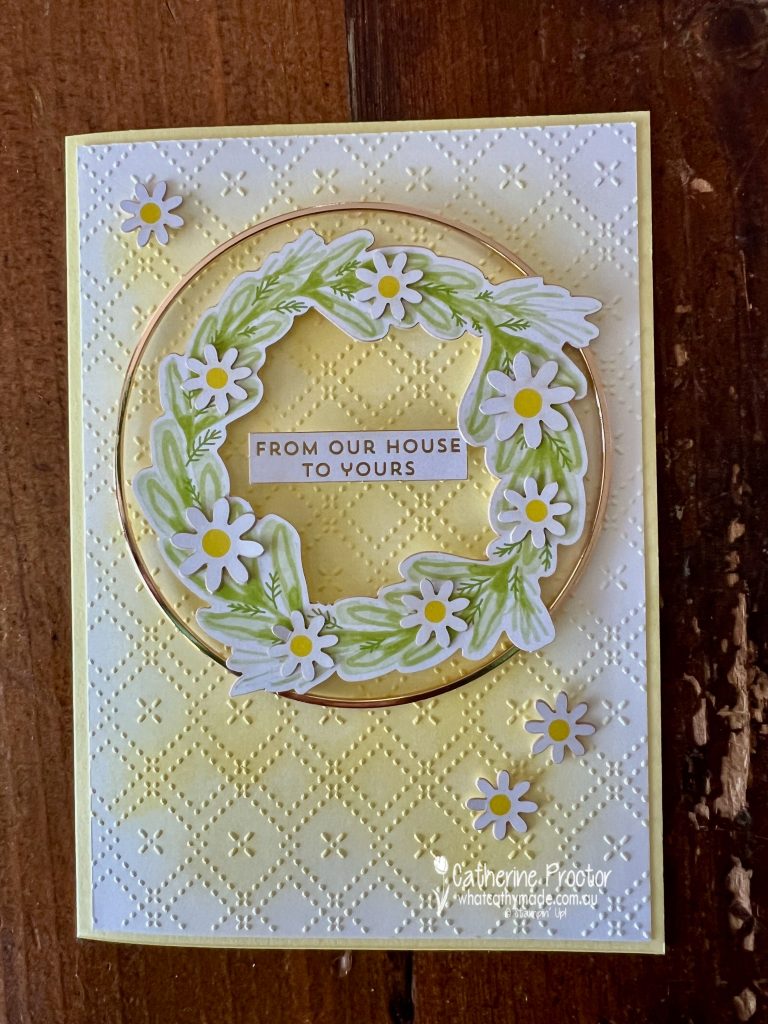 The colour combination is Lemon Lolly (card base and ink blending), Darling Duckling (flower centres), Granny Apple Green (wreath), Basic White (embossed layer) and Gold Foil accents.