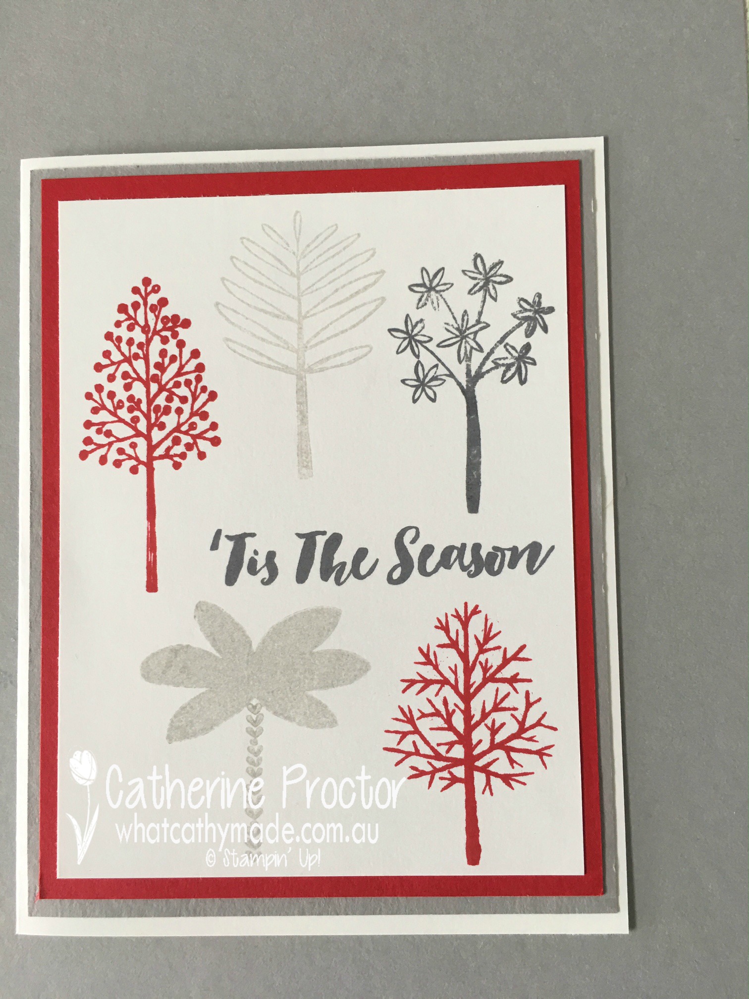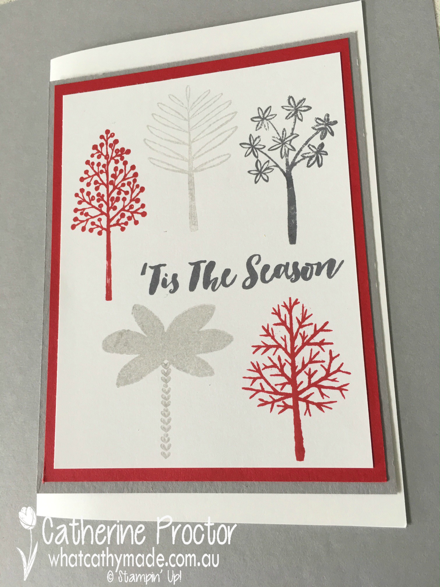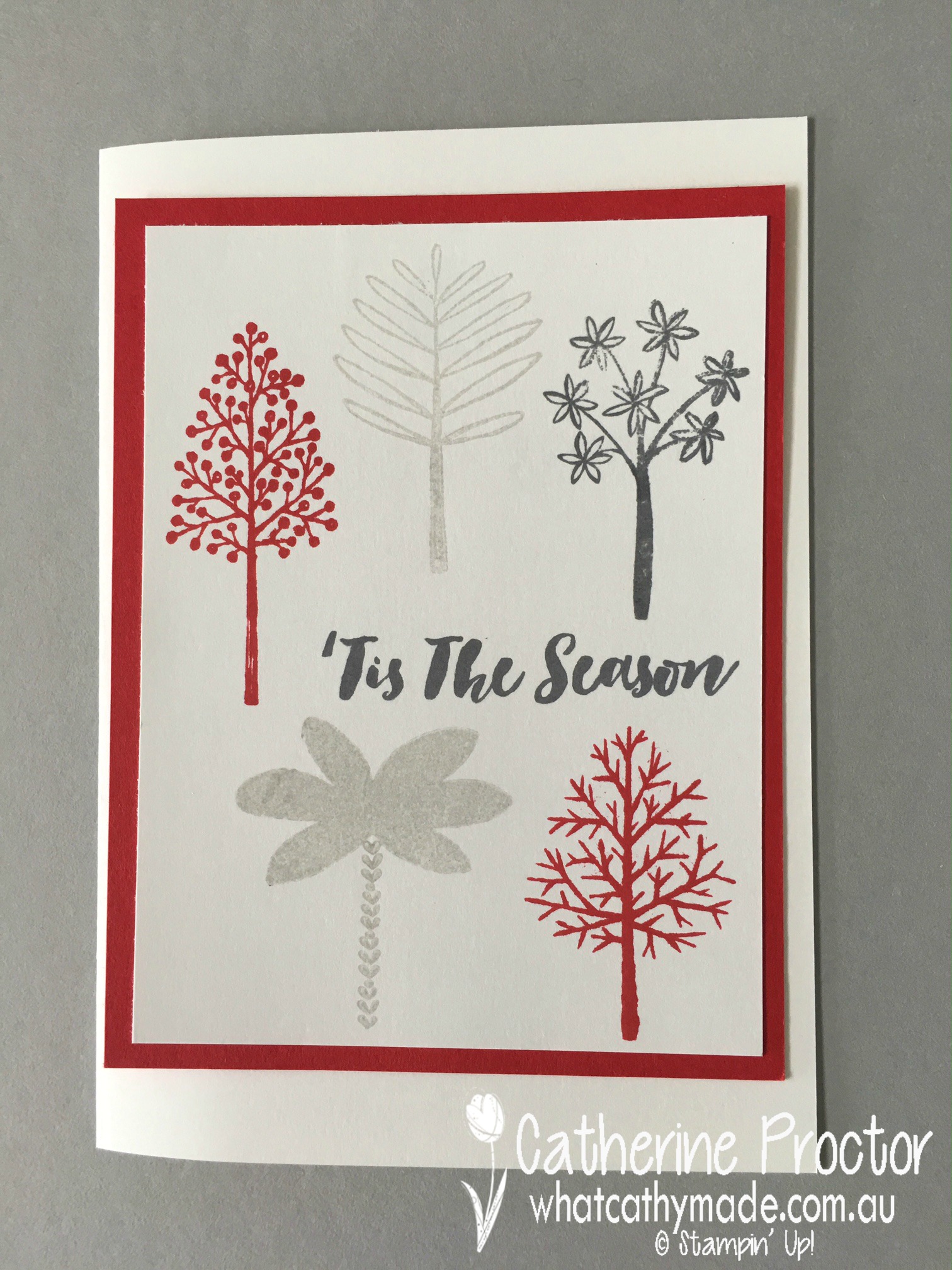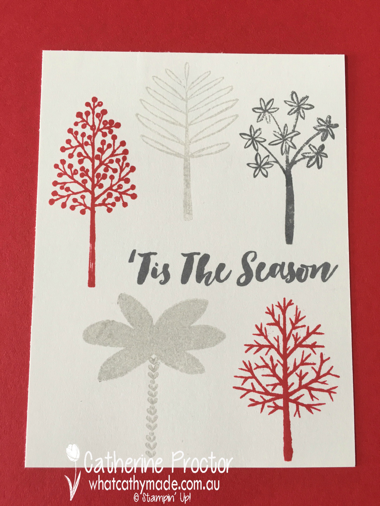 I realised the scale of my stamps wouldn’t allow me to have as many trees on my card so I just started to play around with my Totally Trees stamp set, using the real red, smoky slate and tuxedo black memento stamp pads on whisper white card stock.