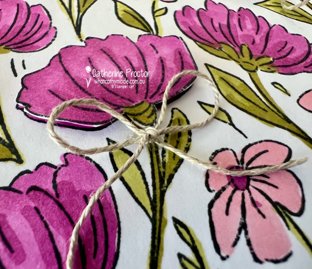 To add dimension, I stamped a second image, fussy cut three flowers and popped them up with Stampin’ Dimensionals. I tucked little bows of Linen Thread underneath each flower for a soft, textured finish.