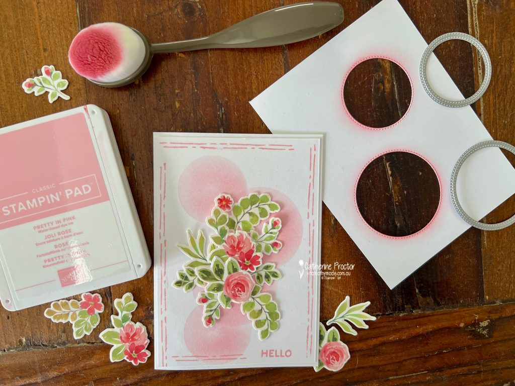 To create the soft background detail, I die cut a few circles from scrap paper using the Stylish Shapes Dies and used them as masks. With a blending brush and Pretty in Pink ink, I gently blended ink through the circular openings to create those soft, dreamy pink circles behind the floral arrangement.