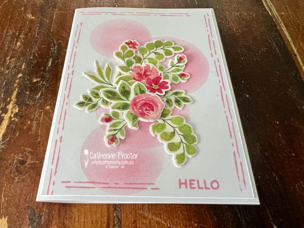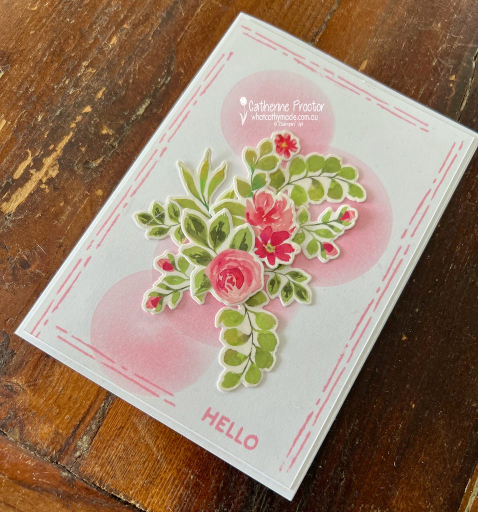 The only stamping on my card is the simple “Hello” sentiment from the Help Me Grow stamp set, sitting in a hand stamped border that I created using the parallel lines stamp in the Extraordinary Flora stamp set.