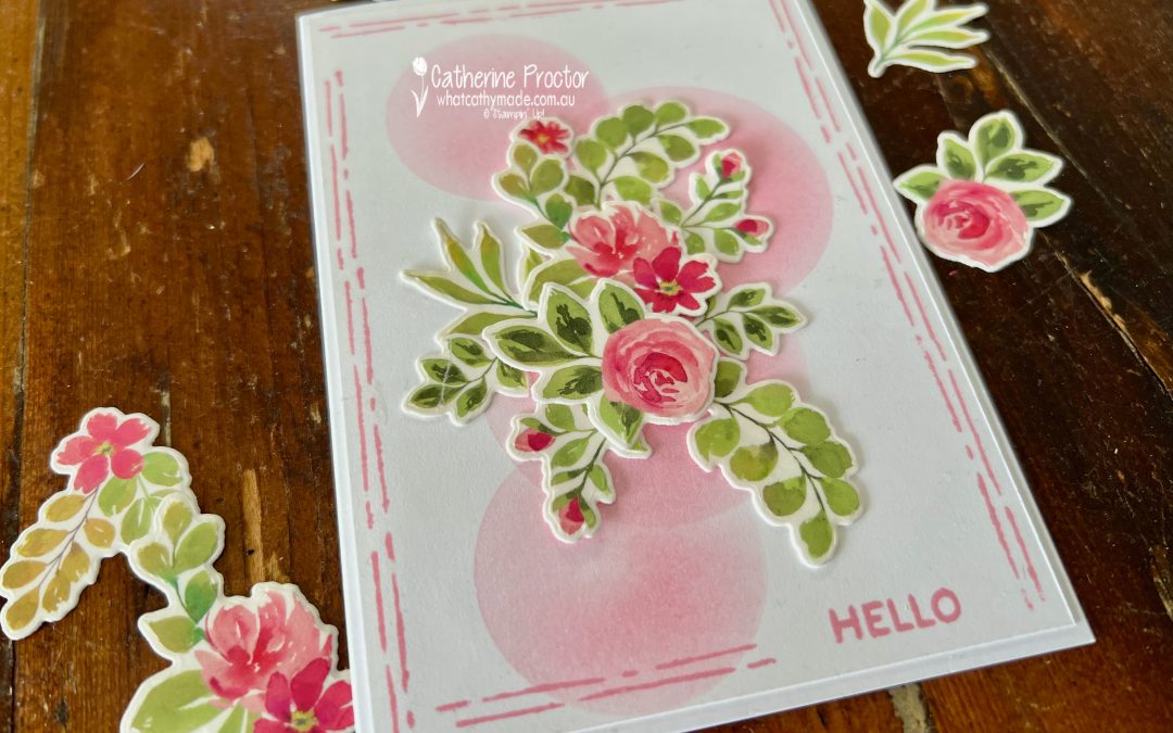 This week for Colour Creations we’re celebrating Pretty in Pink and I’ve created a soft floral hello card using hand made masks to create shading for the background layer.